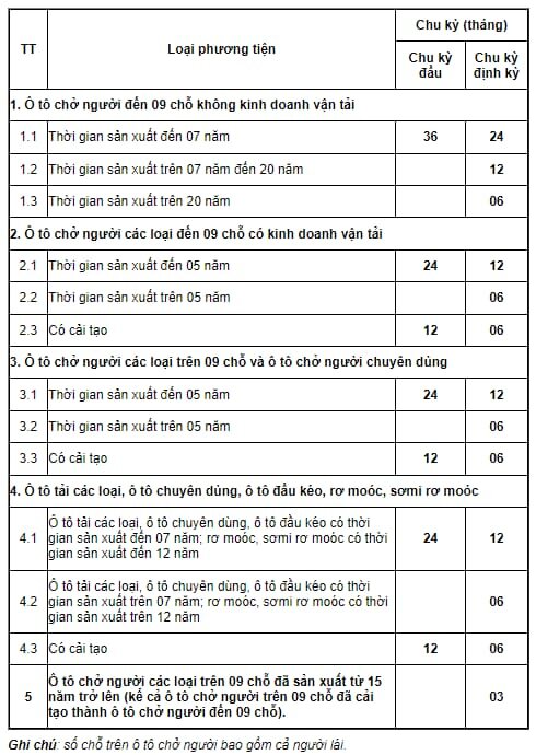 Theo Thông tư 16/2021/TT-BGTVT của Bộ Giao thông vận tải, chu kỳ đăng kiểm cho xe ô tô chở người đến 9 chỗ được quy định như sau: